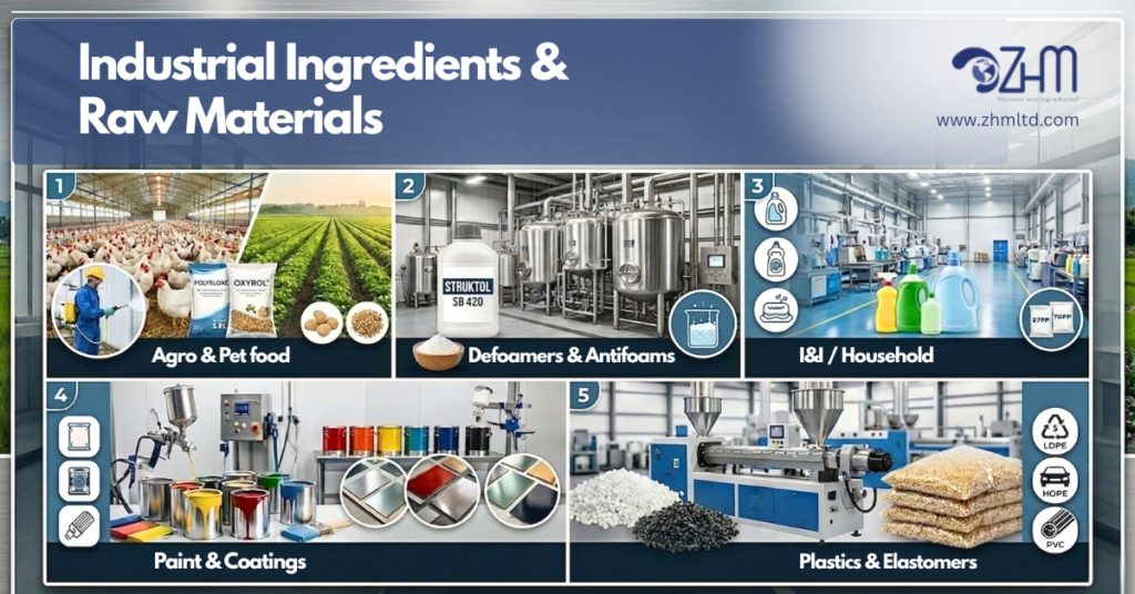 ZHM Group supplies over 200+ raw materials spanning five core categories: Agro & Pet Food chemicals, Defoamers (STRUKTOL), I&I Household detergents, Paint & Coatings additives, and Plastics & Elastomers.