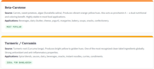 - Competition is intensifying. As more brands enter Bangladesh's packaged food market, natural colors offer a genuine differentiation point — especially in beverages, dairy, and confectionery.